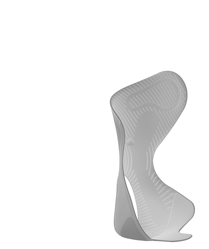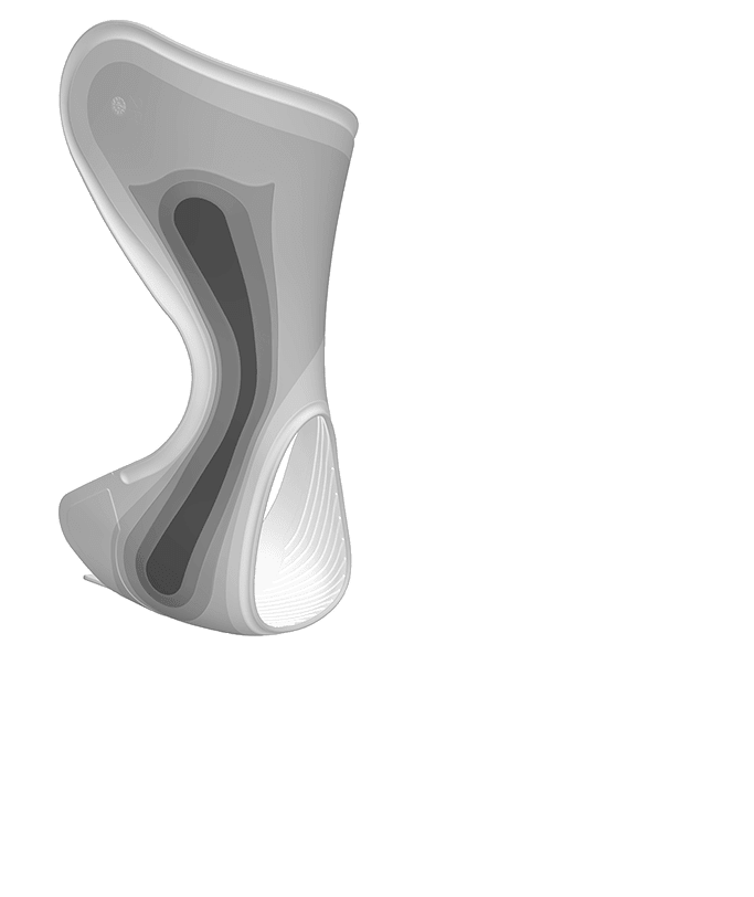 The medial reinforcement is redesigned, featuring a shell that is rigid in the centre with increased flexibility towards the edges. The shell encloses the lower leg, ankle and heel and has a recess for the malleolus.